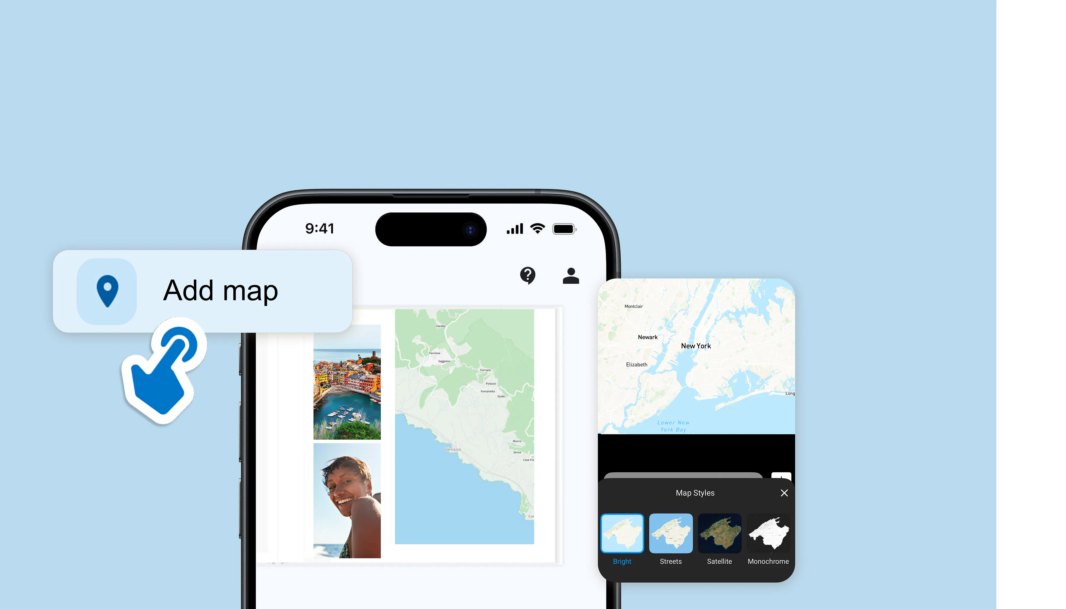 Просто добавете карта с маршрута и всички дестинации директно във вашия фотоалбум Pixum. Оформете картата по свой вкус с различни стилове на текста и клип-арт – точно както ви харесва.